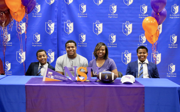 Congratulations to Sanplice Simien, who has committed to play football next year at Northwestern State University of Louisiana! Sanplice is the son of Shameka and Sanplice Simien. He is a senior who has attended St. Frederick High School for six years. His younger brothers, Stephen and Sean, will be members of the St. Frederick class of 2030.